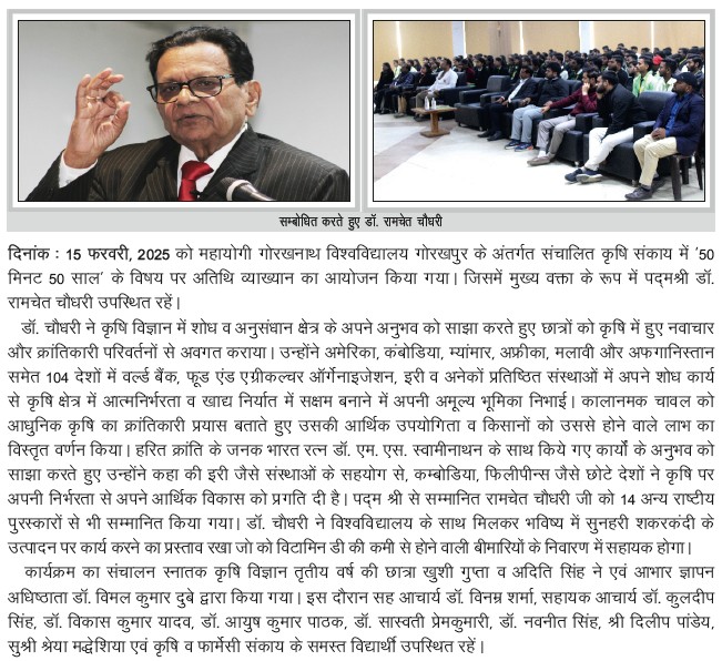 | कृषि संकाय में "50 मिनट 50 साल " के विषय पर अतिथि व्याख्यान | View | 15-Feb-2025 |