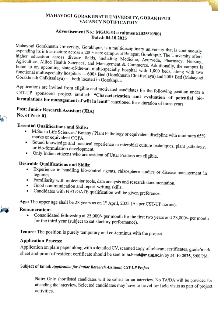 Recruitment Advertisement for the Post of Junior Research Assistant (Agriculture) | View | 28-Oct-2025 |
