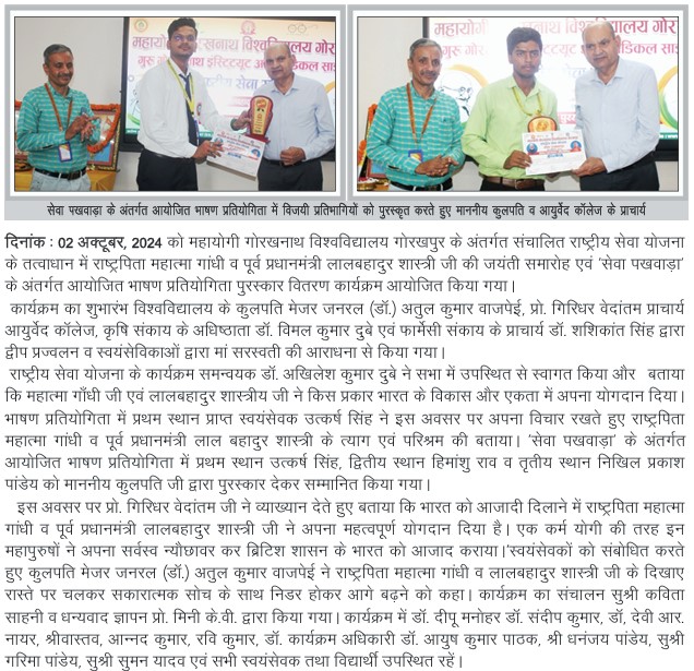 | राष्ट्रपिता महात्मा गांधी व पूर्व प्रधानमंत्री लालबहादुर शास्त्री की जयंती समारोह एवं पुरस्कार वितरण कार्यक्रम | View | 02-Oct-2024 |