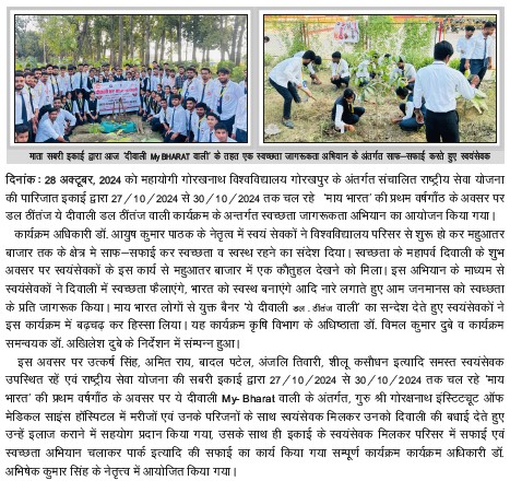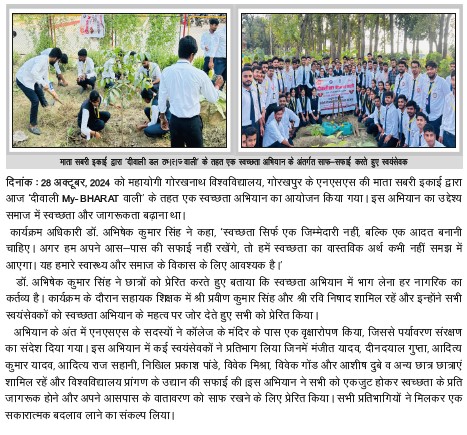 | NSS की पारिजात इकाई द्वारा "दीवाली MY BHARAT वाली" के तहत स्वच्छता अभियान का आयोजन | View | 28-Oct-2024 |
