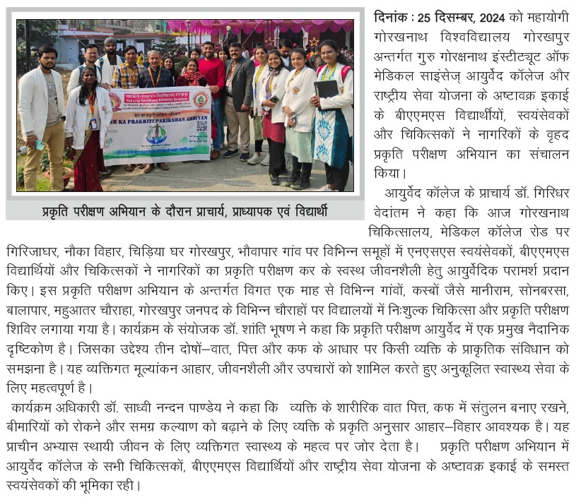 | NSS के अष्टावक्र इकाई के बीएएमएस विद्यार्थीयों द्वारा वृहद प्रकृति परीक्षण अभियान का संचालन | View | 25-Dec-2024 |