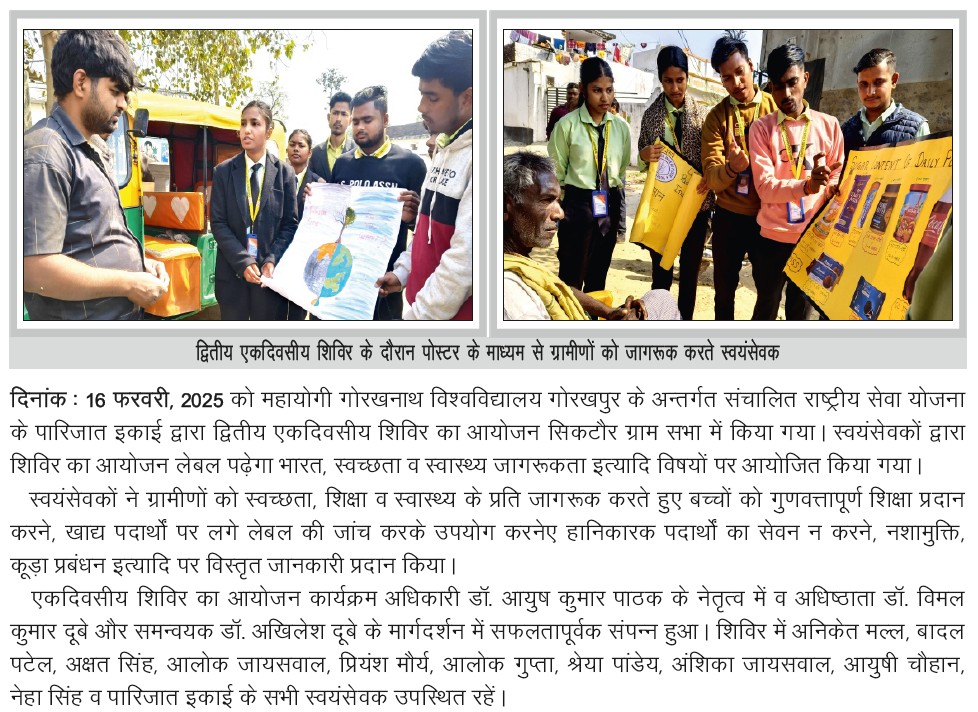 | NSS के पारिजात इकाई द्वारा ग्राम सभा में द्वितीय एकदिवसीय शिविर का आयोजन | View | 16-Feb-2025 |